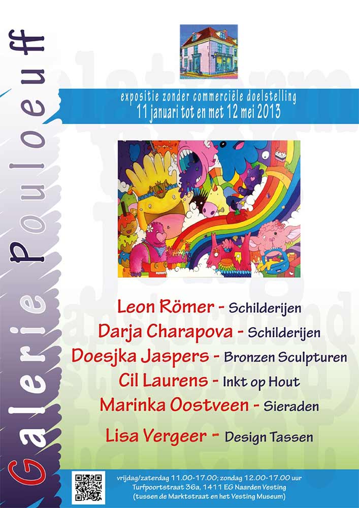 Daarom deze tassen, eigenzinnige sieraden, verfijnde inkttekeningen op hout, kleurige vrolijke monsters op doek, het Hooglied, de stad en de natuur als inspiratiebron voor bronzen sculpturen en schilderijen. Te bewonderen tijdens de nieuwe expositie in Galerie Pouloeuff vanaf vrijdag 11 januari 2013.