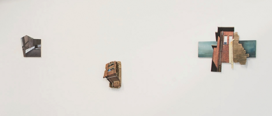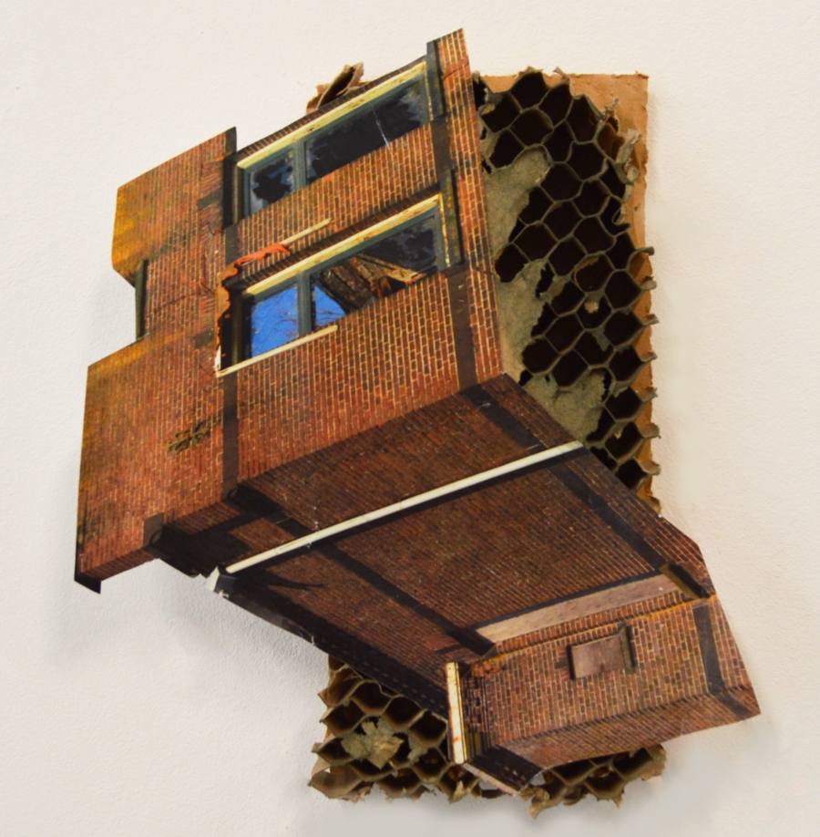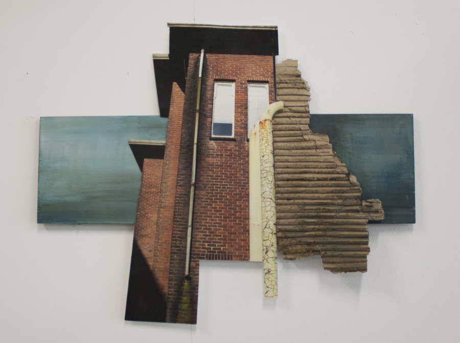 De collages zien eruit als vervreemde ruimtes. Deels herkenbaar als een gebouw gecombineerd met verschillende materialen. De herkenningspunten moeten met de fantasie van de kijker aangevuld worden om te begrijpen wat je ziet.