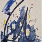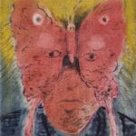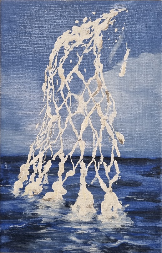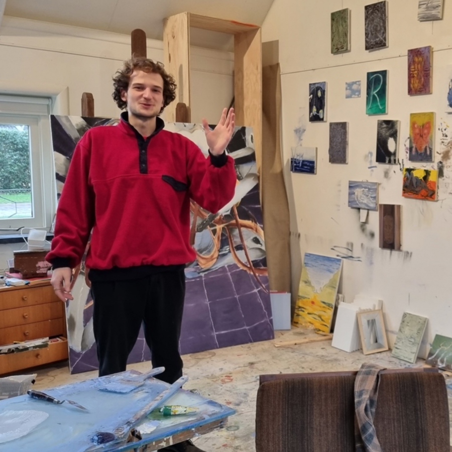 De kleurrijke olieverfschilderijen van Jochem Mestriner (1998) bevatten allerlei echte en fictieve personages, scenario’s en verhalen. Personages uit het ene schilderij duiken op in een ander schilderij, waardoor er nieuwe patronen of verhaallijnen kunnen ontstaan. Op speelse wijze vervormt Mestriner zijn onderwerpen, van de zee tot letters, van dieren tot literatuur.