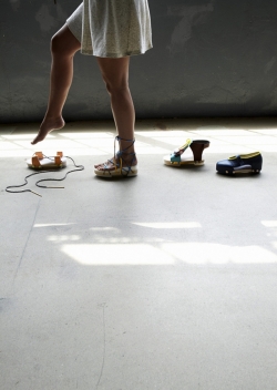 Deze schoen heeft een zool voor alle seizoenen; gemaakt van hout en kunststof, het biedt een solide basis voor elke outfit. Het bovenste deel is aanpasbaar naar smaak - een combinatie van touwen en leer in verschillende kleuren – en wordt met gekleurde metalen schroeven bevestigd. Er zijn zachte pastelkleuren voor de lente en de warme tinten van bordeauxrood en mosgroen voor de herfst. "Deze schoenen zijn perfect voor praktische vrouwen," zegt Noesha Hu. "Ze kunnen de schoenen aanpassen zonder elk seizoen een nieuw paar te kopen."
