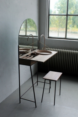 Paola Sabourin is van mening dat deze 'zorg' momenten extra aandacht verdienen en in een intiemere setting. Geïnspireerd door de 16e-eeuwse kleedkamers, ontwikkelde ze een kap- en wastafel die deze rituelen naar de rustige heiligdom van de slaapkamer verhuizen. 'Composure' is een reeks vrijstaande meubels met wastafel, opslag en spiegel die in gerangschikte compositie is samengesteld, afhankelijk van de verschillende behoeften.