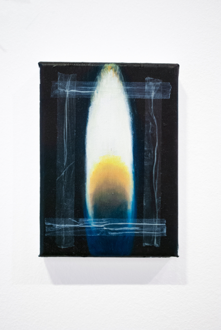 In de expositie toont ze gelaagde werken waarin alledaagse elementen dienen als symbolische achtergronden, met op de voorgrond een abstract lijnenspel in tape en half transparante olieverf. Door deze lagen te combineren ontstaat er een visuele spanning tussen voor- en achtergrond, waarbij licht door de verschillende dimensies van het beeld schijnt in haar eigen veranderlijke spel.