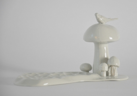 Een fantasiewereld geïnspireerd door architectuur en landschappen waarbij de bekers eruit zien als bergen en de amuses op kleine eilandjes komen te liggen. De witte borden met bomen en vogels worden gevuld met eten. Dit is wat het servies kleur geeft.