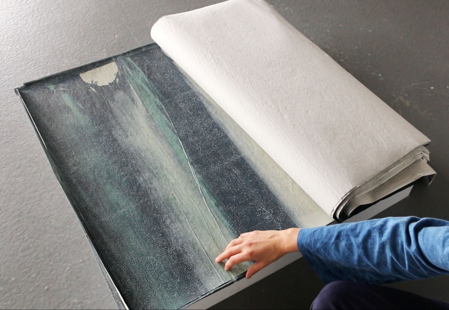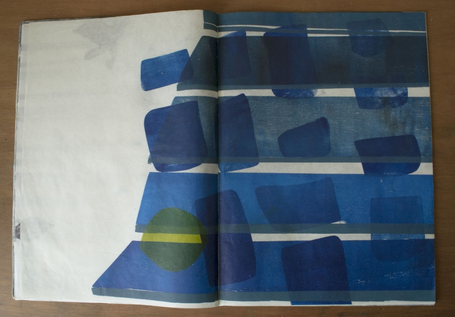 “De appels worden geplukt en naast elkaar gelegd op de tafel. De melodie begint. De strijkstok wordt langs de plantenstelen gestreken.” Zo begint de tekst die Annelotte Lammertse (1993) schreef voor een opera en waarop haar werk ‘tuinbladen’ is gebaseerd. Dit werk bestaat uit houtdrukken, zeefdrukken, etsen, litho’s en weefsels. De operatekst en de bijbehorende grafiek- en weefwerken komen voort uit haar fascinatie voor het bezig zijn in de tuin en de relatie van de mens tot de natuur die daaruit voortkomt.