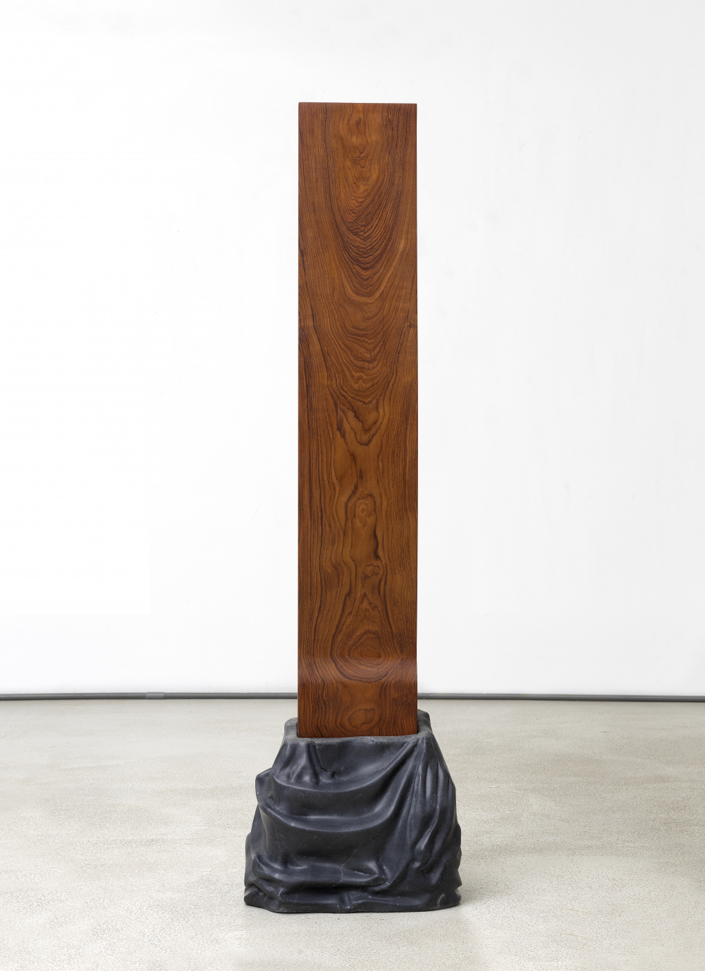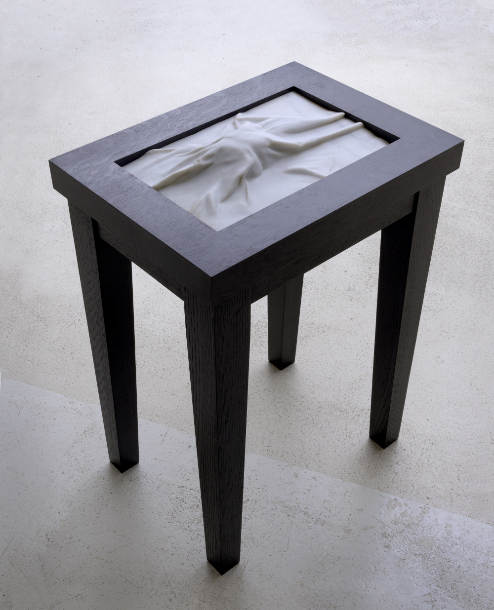 Van Deelen kijkt naar de eigenschappen en potentie van de traditionele materialen steen, hout en beton. Hoe kan hij die onthullen en laten spreken? Dit doet hij bijvoorbeeld met marmeren stofuitdrukking in de vorm van een geplooid doek verzonken in een eikenhouten tafelblad. Of een teakhouten vorm die uit geplooid marmer lijkt te rijzen.