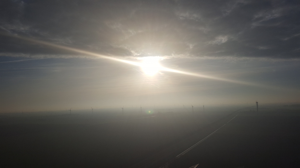 De video laat een zonsondergang zien vanaf een windmolen. Een windmolen in de Flevopolder. Poëzie is leidraad in haar films en video.