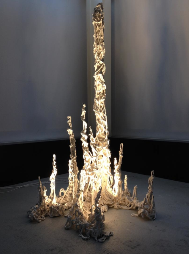 Door gebruik van materiaal en licht en de plaatsing in de ruimte vindt telkens een transformatie plaats. Het licht in het werk dat zij heeft gemaakt, wisselt om de paar minuten van sterkte. Hierdoor ontstaat er een schimmenwereld dat telkens iets veranderd. Het werk is gemaakt van oude in repen gescheurde T-shirts en leggings. Deze heeft zij in gips gedoopt, waarna zij het werk heeft opgebouwd. Het hoogste deel wordt ondersteund door een metalen frame. De kleine ’torentjes’ staan volledig op zichzelf.