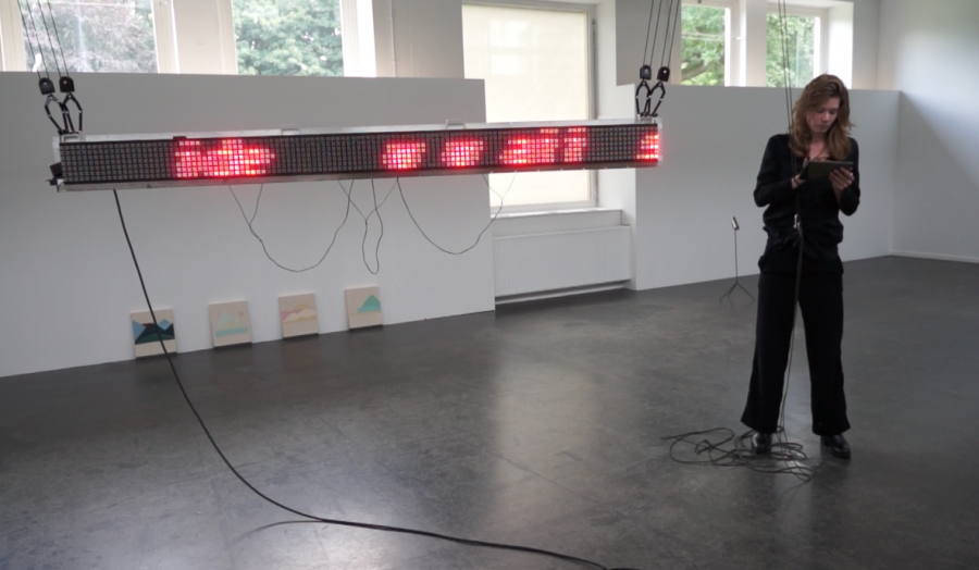 Jaleesa Mallée laat in haar werk “Being read” via de lichtkrant teksten voorbijkomen die zij als buitenstaander opvangt tussen een spreker en een ontvanger.