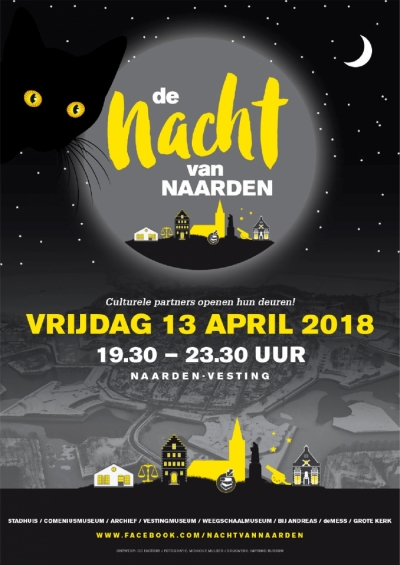 Galerie Pouloeuff zal deze avond ook open zijn om de avondbezoekers welkom te heten. Tegen het prachtige decor van de Vesting Naarden, openen de culturele partners op deze avond hun deuren voor iedereen die het culturele erfgoed van dichtbij wil bekijken! Kom vonnis halen op het oude Stadhuis, maak kennis met Jan Amos Comenius, ontdek de historie bij het Stadsarchief, ontmoet onverwacht bezoek bij het Vestingmuseum, kijk mee door de ogen van Lambertus Hortensius in het Weegschaalmuseum, geniet van klassieke muziek Bij Andreas, luister naar soldatenliedjes bij Podium deMess en sluit af ‘Bij geloof, hoop en liefde’ in de indrukwekkende Grote Kerk van Naarden.