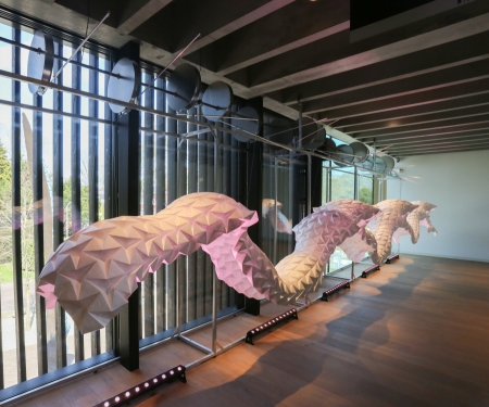 Changing the Gaussian Curvature, het werk dat nu gepresenteerd wordt in Window of Opportunity in het Singer, is een resultaat van dat onderzoek. Het tien meter lange mechanisme zet een driehoekige herhalende vouw (tessellatie) in beweging. De lange gevouwen baan golft achter het raam op en neer. Hierbij krimpt het oppervlak van de tessellatie in de dalen en zet het uit bij de pieken.