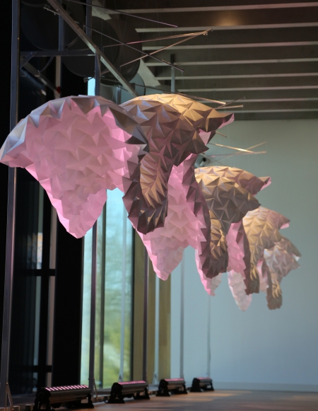 Als je een papier buigt is het krom, maar is de Gaussische kromming nog steeds 0. Pas als het materiaal intrinsiek kromt, dus als je een vel uit zou kunnen rekken zoals een zwart gat in de ruimte doet, verandert de Gauss-waarde. Door de aard van de driehoekige vouw is deze bijzondere verandering van het gevouwen vlak waar te nemen. Als je goed kijkt kun je dit werk zien krimpen en strekken terwijl het op-en-neer vloeit door het museum.