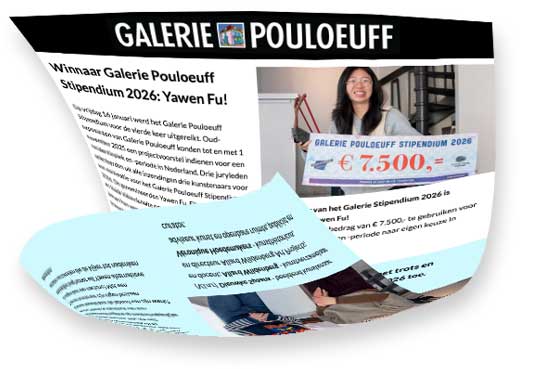 Sinds 2023 reiken wij het Galerie Pouloeuff Stipendium uit: een prijs voor kunstenaars die eerder bij Galerie Pouloeuff hebben geëxposeerd en behoefte hebben aan een periode van intensief onderzoek binnen hun werk. Het stipendium, ter waarde van € 7.500, is te gebruiken voor een residentie plek en periode naar eigen keuze in Nederland.