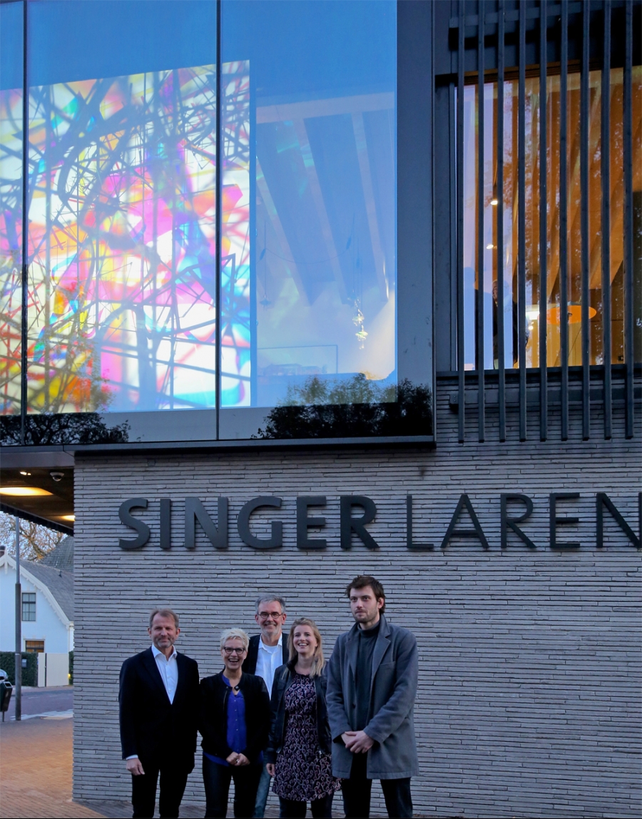 De opening vond tegen de schemering buiten, voor de gevel van Singer Laren plaats. Want dit werk komt pas echt tot zijn recht wanneer je het museum juist níet binnen gaat … BEKIJK DE FOTO’S >